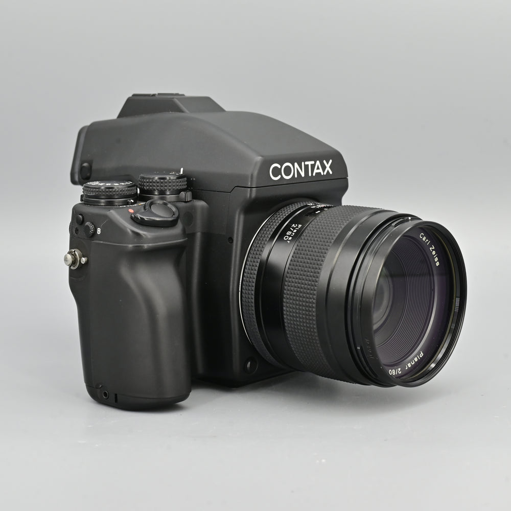 The Contax 645 is a medium-format film camera exclusively designed for serious and professional photographers. It has both manual and automatic focus modes. The communication between the lens, body, filmbacks, and viewfinders is purely electronic. This minimizes mechanical wear and tear, and it improves the design and expansion flexibility. The shutter assembly is metallic and electronically controlled, reaching speeds of up to 1/4000s. The viewfinders are interchangeable, with the primary AE (with center-weighted and spot metering) easily swapped for a waist-level finder. It allow for data imprinting as well as a film barcode reader. The camera utilizes in-lens motors and is compatible with a wide range of Carl Zeiss lenses.